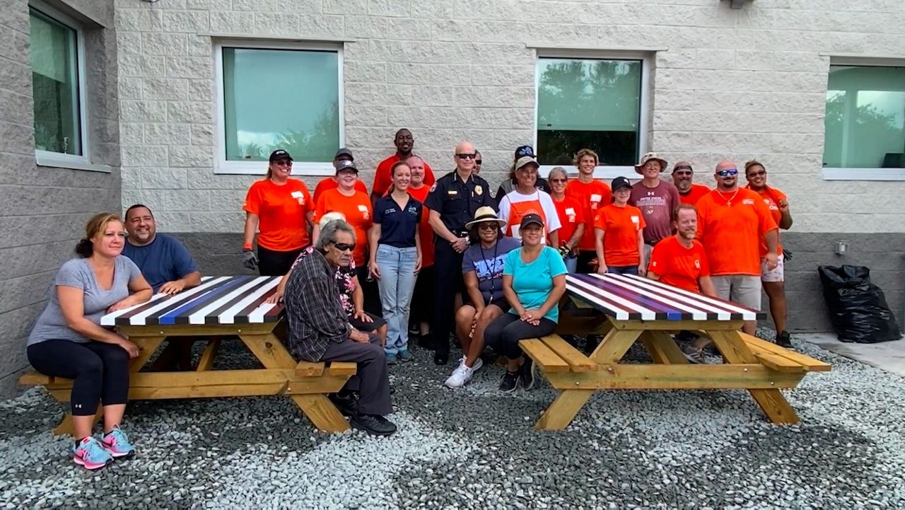 Both picnic tables are adorned with “Back the Blue” flags, showing their support for law enforcement officers – officers like Navedo, who have served and protected his community for decades.
